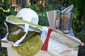 Hat with vail, bee jacket, smoker, brush and hive tool.